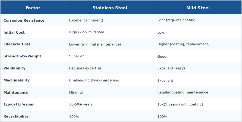 Stainless steel typically costs 2-5 times more per kilogram than mild steel. However, when factoring in lifecycle costs including maintenance, coating replacement, and potential structural replacement, stainless steel often proves more economical for corrosion-prone environments.